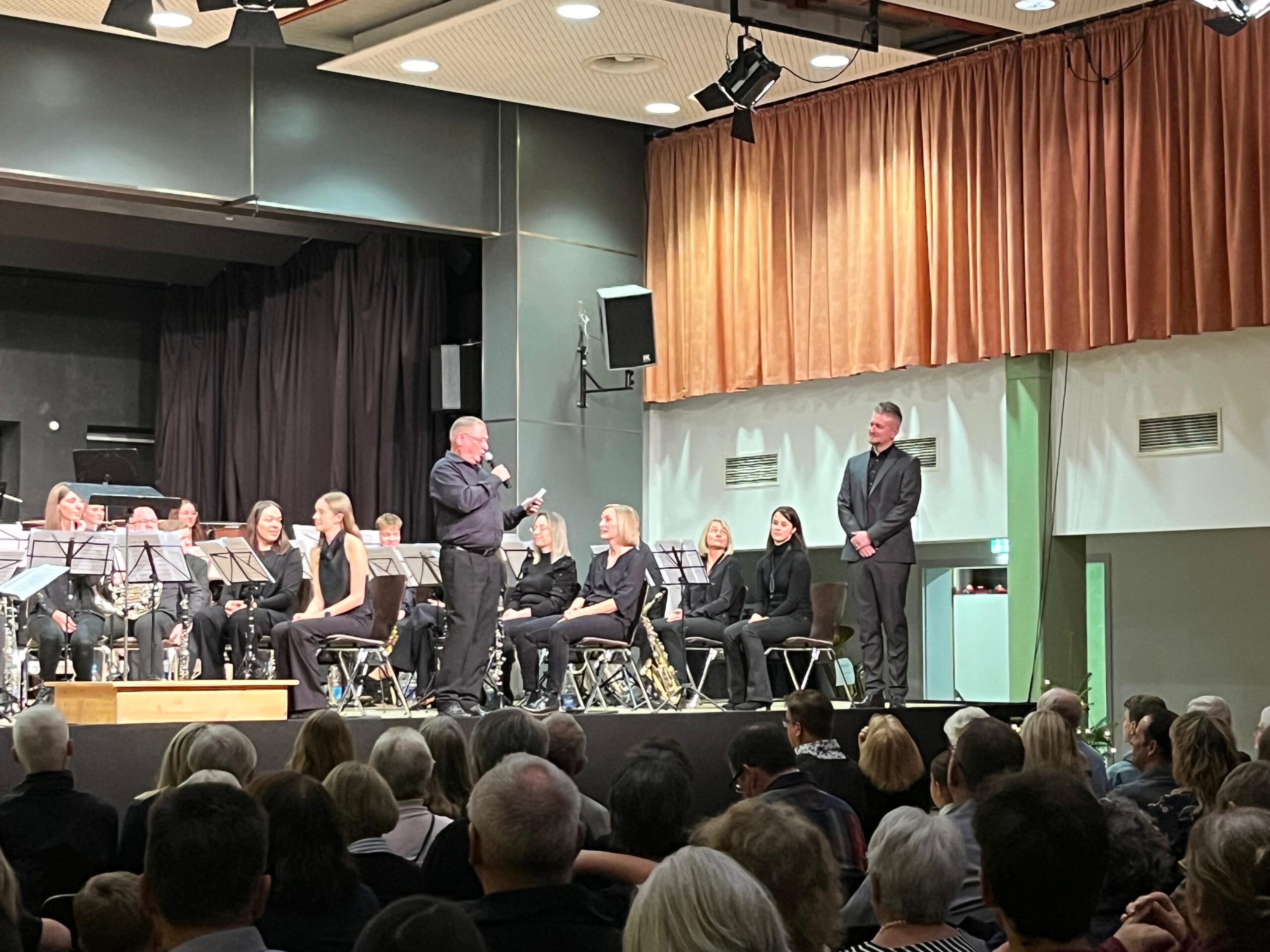 Mit „Belvedere“ von Klaus-Peter Bruchmann folgte anschließend ein ruhigerer und feierlicher Programmpunkt. Das Werk zeigt klare Strukturen und würdige Melodien und vermittelte einen harmonischen, fast majestätischen Charakter. Mit dem Stück „Ein Walzertraum“ von Oscar Straus in der Bearbeitung von Christian Dumphart zog eine romantische Leichtigkeit in die Gemeindehalle ein. Der elegante Walzer ließ das Publikum in die Welt der klassischen Operettenmusik eintauchen. Sehnsucht und Lebensfreude wurden durch schwungvolle Walzerrhythmen und die melodische Leichtigkeit versprüht. Mit diesem Stück verabschiedete sich das Gesamtorchester in eine kurze Pause. Das Publikum stärkte sich mit köstlichen selbstgemachten Häppchen, die angelehnt an die bisherigen Stücke vorbereitet wurden, sodass das Publikum auch kulinarisch in die einzelnen Klangwelten eintauchen konnte.
